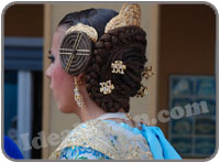 The costumes worn for Las Fallas are traditional valencian style, brightly coloured and decorated with gemstones, jewellery and sequins. The ladies hair is quite unique. A coil of hair is worn on either side.